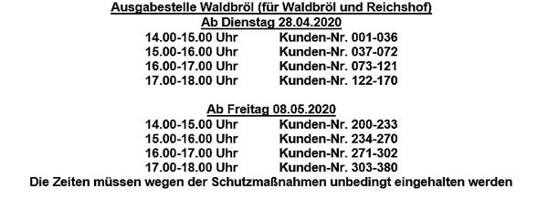 Die Tafel Oberberg Süd wird ihre Arbeit ab nächster Woche wieder aufnehmen. Supermärkte haben signalisiert, dass Ware abgeholt werden kann. Viele private Helfer und Organisationen haben ebenfalls ihre Hilfe angeboten. Ältere Tafelnutzer für Waldbröl und Reichshof sind informiert worden, dass sie einen Lieferservice in Anspruch nehmen können. Auch in den Außenstellen Wiehl (ab 4. Mai), Nümbrecht (ab 7. Mai) und Morsbach (ab 7. Mai) gibt es einen kompletten Lieferservice. Die Tafelnutzer werden über die genauen Zeiten persönlich informiert.