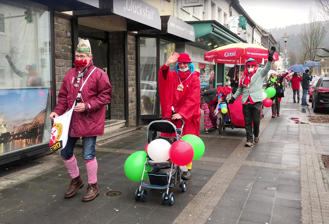 Nicht ganz, denn in den vergangenen Tagen hatten sich einige Hardcore-Karnevalisten Gedanken gemacht, wie man unter Corona-Bedingungen dennoch einen Alternativ-Zoch hinbekommen könnte. Die Lösung war ein Auto-Korso, der sich seinen Weg von der Hardt in den Ort bahnte. Mit lautem Gehupe und bei Karnevalsmusik waren die Jecken in den etwa 40 Fahrzeugen bester Stimmung. Und auf dem Bürgersteig begleitet wurden sie von einigen Karnevalisten, die gemeinsam mit dem Auto-Konvoi den mit Abstand wohl ausgefallensten und kleinsten Zoch in der Geschichte des Engelskirchener Karnevals bildeten.