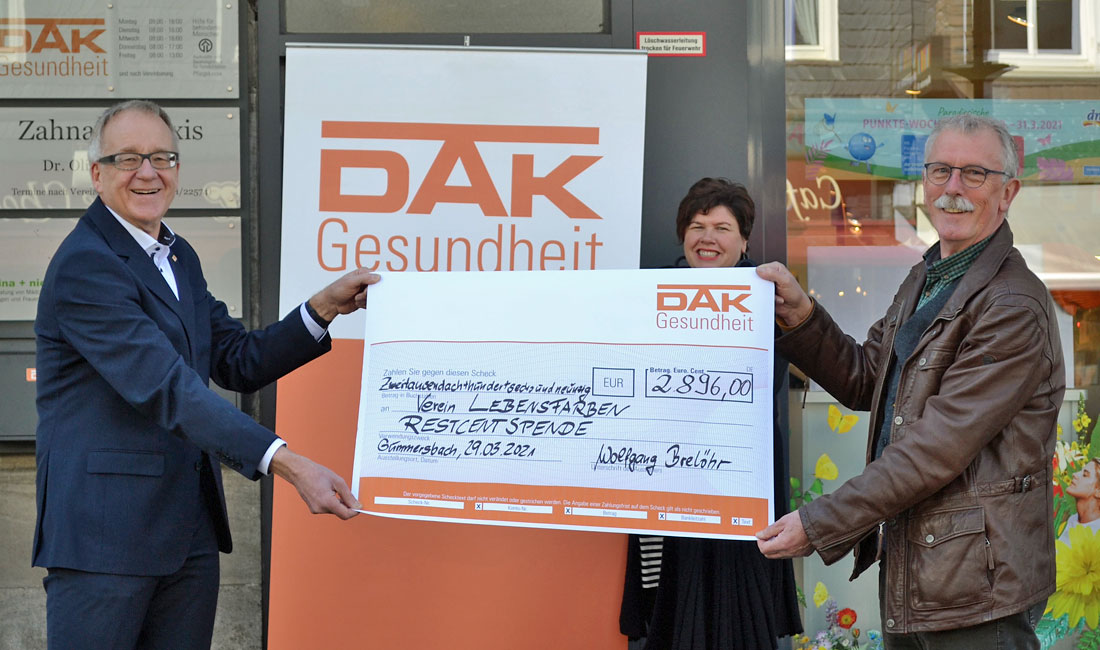 Mit einer Spende in Höhe von 2.896 Euro unterstützen Beschäftigte der DAK-Gesundheit die Arbeit des Vereins „Lebensfarben“ mit Sitz in Wiehl. Der Verein bildet Paten zur Unterstützung von Kindern und Jugendlichen mit einem psychisch oder suchterkrankten Elternteil aus. Das Geld stammt aus der bundesweiten Mitarbeiter-Aktion „Nullkommaviel – Spend‘ deinen Cent“. Mehr als 7.100 Teilnehmer der Krankenkasse verzichten auf die Centbeträge hinter dem Komma oder höhere Beträge ihrer Gehaltsabrechnung. In jedem Monat wird eine andere Hilfsorganisation ausgesucht, Vorschläge können die Mitarbeiter selbst einreichen.