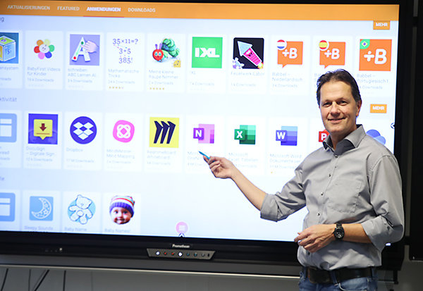 [Realschulleiter Ralf Zimmermann demonstriert die Stärken der neuen „ActivPanels“ in den Klassenräumen]