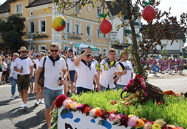 Nach dem Festgottesdienst am Sonntag wurde im Pfarrgarten der traditionelle Baum des neuen Erntepaares gepflanzt. Und am frühen Nachmittag setzte sich dann der Festumzug in Bewegung. Der Bläserchor Much, das Blasorchester Siebenbürgen-Drabenderhöhe, der Musikverein Heddinghausen und Ara Macao mischten sich unter die rund 30 Teilnehmer und begleiteten das Spektakel musikalisch. „Es hatten sich deutlich mehr Wagenbauer und Zugteilnehmer angemeldet als im Vorjahr“, sagte Volker Stache, Vorsitzender des Erntevereins.