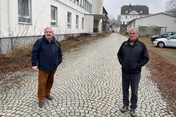 [Bürgermeister Stefan Meisenberg (li.) mit Investor Dieter Lindenbaum beim Rundgang.]