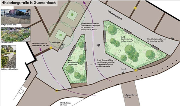 Gummersbach – Zugang zur Fußgängerzone an der Hindenburgstraße wird entsiegelt und bekommt zwei Staudenmisch-Biotope – Im Windhagener Gewerbegebiet werden vier Wendeschleifen entsiegelt – Maßnahmen zu 100 Prozent gefördert.