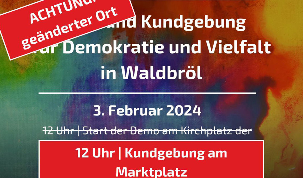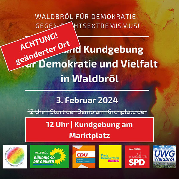 Gummersbach, Morsbach oder Lindlar haben es im Oberbergischen vorgemacht, nun findet auch in Waldbröl eine Demonstration gegen Rechtsextremismus und für Demokratie und Vielfalt statt. Treffpunkt am Samstag, 3. Februar, ist um 12 Uhr direkt am Marktplatz. Ursprünglich sollte sich zunächst am Platz vor der evangelischen Kirche in Waldbröl getroffen werden, was aus organisatorischen Gründen aber geändert wurde. Dies teilen CDU, SPD, Grüne, FDP und UWG aus Waldbröl mit, also sämtliche im Stadtrat vertretenen Parteien und die Wählergemeinschaft.