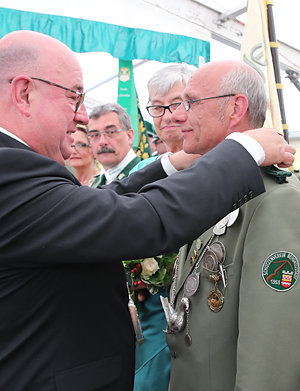 „Ich bin ja schlau und habe die anderen erstmal die Arbeit machen lassen“, meinte der 56-jährige Uelner zu seinem Glücksschuss. Ähnlich sah äußerte sich Bürgermeister Wilfried Holberg im Rahmen des Schießbericht anlässlich der Krönung der neuen Majestäten am Pfingstmontag im Festzelt. „Und dann das Ding, was man mit dem sprichwörtlichen blinden Huhn in Verbindung bringt: Mit dem 144. Schuss und gleichzeitig dem besten seiner gesamten Schützenlaufbahn holte Uelner den Vogel von der Stange.“