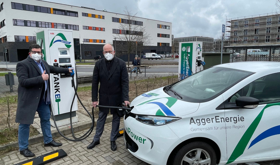 Es sind die ersten beiden Schnellladestationen für Elektroautos in der Gummersbacher Innenstadt, die heute Morgen auf dem Park&Ride-Parkplatz am Gummersbacher Steinmüllergelände in Betrieb genommen wurden. Die Besonderheit: Mit bis zu 50 Kilowatt (kW) schießt der Strom in die Akkus, somit ist das Fahrzeug in etwa zwei Stunden voll betankt. 80 Prozent Akkuleistung sind sogar in rund einer Stunde möglich. Zwei dieser Ladepunkte weihten der AggerEnergie-Chef Frank Röttger und Gummersbachs Bürgermeister Frank Helmenstein heute Morgen ein.