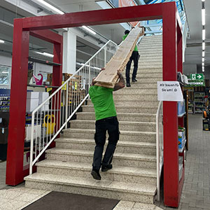 Auch an den Sortimenten wird kräftig gearbeitet. Im ehemaligen Gartenbereich werden Regale umgebaut, Sortimente ziehen an andere Stellen und Wände werden neu verkleidet. Auf diese Art wird im Erdgeschoss Platz für die neue Heimtierabteilung und den ’regional Markt’ geschaffen. Zukünftig wird auf der rechten Seite des Baumarktes neben dem bekannten Gartenbedarf auch Heimtiernahrung und Zubehör für Hunde, Katzen, Nager und Ziervögel zu finden sein.