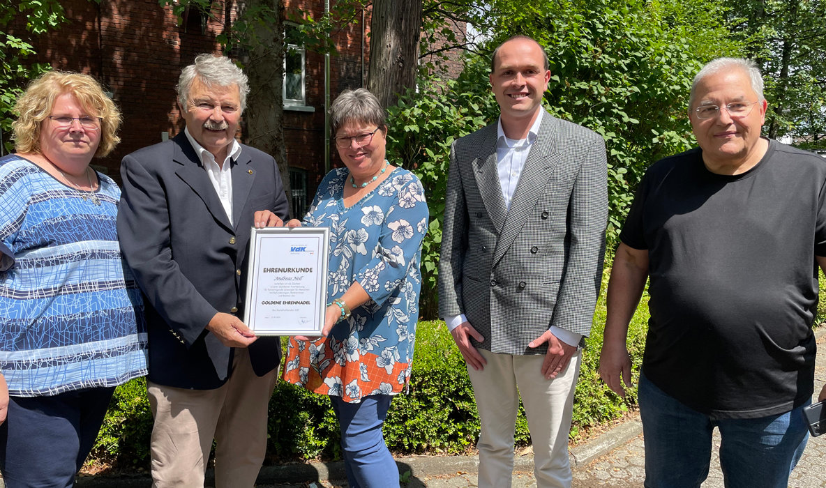 Andreas Noll wurde am Mittwoch für seine Verdienste als ehemaliger Kreisvorsitzender und Ehrenvorsitzender des VdK Oberberg mit der höchsten Auszeichnung des VdK ausgezeichnet. Er erhielt die goldene Ehrennadel des VdK Deutschland. Bei einer Feierstunde im Kreisverband Oberberg überreichte der amtierende Vorsitzende Rainer Lenkeit die goldene Ehrennadel mit entsprechender Urkunde. Anwesend war auch der Geschäftsführer Johannes Walter Gerhardt, der ebenfalls ein Präsent überreichte.
