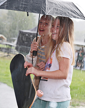 [Die jungen Leute ließen sich die Stimmung trotz Bindfaden-Regens nicht verhageln.]