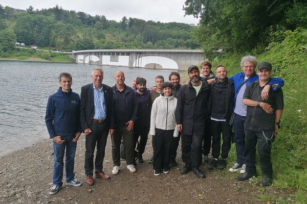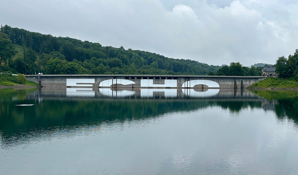 In den vergangenen Wochen wurde auf der Wasserseite der Staumauer der Schriftzug „ECHO“ angebracht – allerdings nur zur Hälfte: Erst die Spiegelung im Wasser vervollständigt das Wort und macht es lesbar. Die Buchstaben der Installation sind zwischen 28 und 34 Meter breit und jeweils 6,50 Meter hoch. Der gesamte Schriftzug hat eine Breite von 137 Metern. Je nach Wasserstand, Sonne, Regen und Wind sieht das Kunstwerk immer wieder anders aus, ist vielleicht auch mal gar nicht zu sehen. „Es ist ein lebendiges Kunstwerk, das sich mit der Natur verbindet und so emotional erfahrbar ist“, meinte Pablo Ferreiro Mederos – und es greift das REGIONALE-Zukunftsthema „Alles Ressource!“ auf.