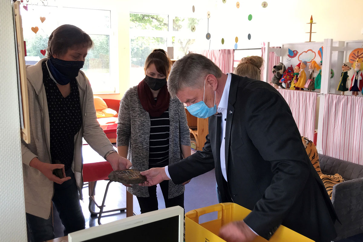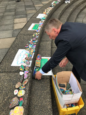 Zwölf Kindertagesstätten, Grundschulen und Förderschulen machten mit ihren 1.300 Steinen den Einsatz eines Kleinbusses notwendig, um alles zu transportieren. Löttgen (Foto) zeigte sich beeindruckt von den sorgfältig formulierten Wünschen und detaillierten Anregungen für die Zukunft. Freundschaft, Frieden und Gesundheit waren dabei ebenso Themen wie der Wunsch nach einem eigenen Zimmer, nach mehr Zuwendung oder mehr Zeit zum Spielen. Einer forderte „Das Virus soll weg!“, ein anderer zeigte die Aufschrift „Alles wird gut.“ „Ob es die längste Steinkette Nordrhein-Westfalens wird, steht noch nicht fest, doch die Kinder aus dem Oberbergischen haben vielleicht den größten Anteil daran, wenn sie es wird!“, sagte der Abgeordnete.
