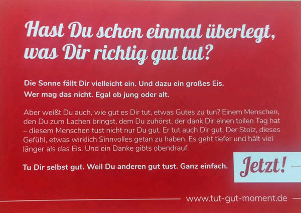 Die Postkarten mit dem markanten „tut. gut.“-Schriftzug sollen künftig großräumig in Kreisgebiet verteilt werden, auf die Internetseite verweisen, dazu soll die junge Generation mit Facebook und Instagram abgeholt werden. Auch ein Portal ist für die Zukunft geplant. Aktuell sind bei der Caritas Oberberg 150 ehrenamtliche Kräfte gemeldet, nach ihrem Wunsch sollen es bald viele mehr werden. „Wir hoffen auf viele Mails und Anrufe“, so Kühr-Honermann.