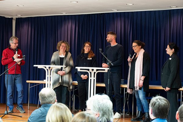 [Pfarrer und Skriba Andreas Spierling (li.) interviewte fünf der neuen Kirchenkreis-Mitarbeitenden – v.l. Gemeindereferentin Evelyn Doelfs, Vikarin Dr. Judith Fresen, Pfarrer Dr. Andreas Scheuermann, Jugendreferentin Simone Reimers-Damelang und Pfarrerin Jenny Caiza Andresen.]