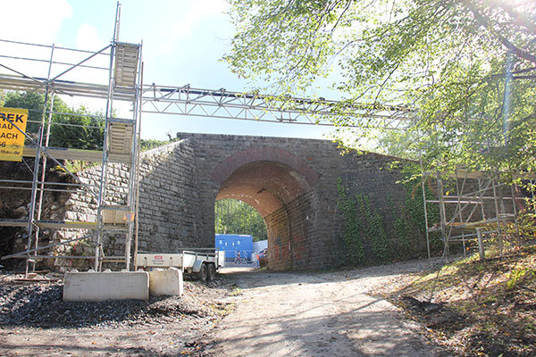 Lange soll es nicht dauern, bis es der altehrwürdigen Brücke an den Kragen geht. „Geplant ist, mit dem Rückbau der Brücke nächsten Dienstag zu beginnen.“ Das Bruchsteinmauerwerk wird mithilfe von Bagger und Abbruchhammer abgetragen. „Das wird einen Tag dauern.“ Dann wird das 130 Jahre alte Bauwerk nicht mehr zu sehen sein. Der Nachfolger aus Stahlbeton wird eine durchgehende Bodenplatte haben. Auch dort wird für zwei Gleise Platz sein.