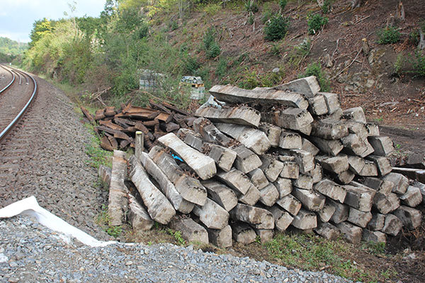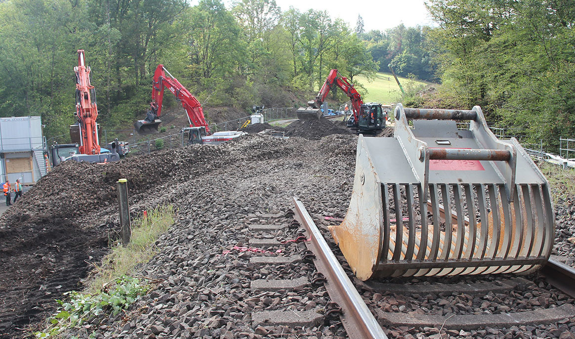 Gerade einmal zwei Stunden braucht die Baufirma, um die Gleise auf einer Länge von 60 Metern zurückzubauen. Dabei kümmern sie sich sowohl um das aktive Gleis als auch um jene Schienen, die schon länger keinen Zug mehr führen durften. Anschließend wird der Gleisschotter großflächig abgebaggert. Drei große Maschinen sind mit dieser Aufgabe betraut. Heute sollen etwa 15 Sattelschlepper vollgemacht werden. Insgesamt 600 Tonnen verlassen das Gleisbett. Der Schotter wird der Entsorgung zugeführt, teils aber zunächst zwischengelagert. Das Material, das nicht zu sehr belastet ist, werde aufbereitet und woanders wiederverwendet, erzählt Maßing.