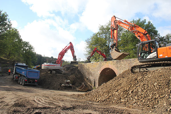 Im nächsten Schritt soll die Brücke komplett freigelegt werden, inklusive der Widerlager. Für die Abfuhr des Bodens werden wie heute auch schon viele Laster von der Westtangente in die für den Straßenverkehr gesperrte Anliegerstraße „Luttersiefen“ einbiegen. Nach der Beladung fahren die Sattelschlepper über den ertüchtigten Feldweg Richtung Theodor-Heuss-Akademie und auf die Kölner Straße.