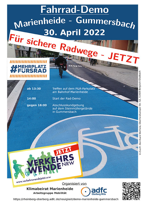 Um der Forderung nach sicheren Radwegen Nachdruck zu verleihen, organisieren die AG Mobilität des Klimabeirats Marienheide und die ADFC Ortsgruppe Oberberg Mitte am Samstag, 30. April, eine Fahrrad-Demo von Marienheide nach Gummersbach. Die Infrastruktur müsse dringend an den zunehmenden Radverkehr angepasst werden, heißt es in einer Mitteilung des ADFC: „Viele würden gerne aufs Rad steigen, wenn es nicht so gefährlich wäre. Doch leider passiert nach wie vor viel zu wenig und eine grundlegende Verbesserung der Situation ist nicht in Sicht.“