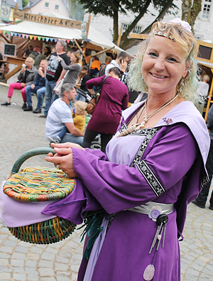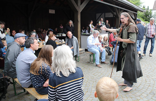 Mit der „ältesten und leisesten Kunst“ beschäftigte sich Tandaniel, der Geschichtenweber. Er erzählte den Besuchern „Märchen im alten Sinne, die nicht für Kinder, sondern für Erwachsene gedacht waren. Doch auch diese Geschichten beginnen mit den drei magischen Wörtern ‚Es war einmal’.“ Er schien vom MAV, dem Mittelaltervirus, genauso infiziert gewesen zu sein wie Pan, der Schmied: „Das sind wirklich ganz aggressiv ansteckende Tierchen.“ Abhilfe würde da bloß das reichliche Trinken von Honigwein und Kirschbier schaffen.