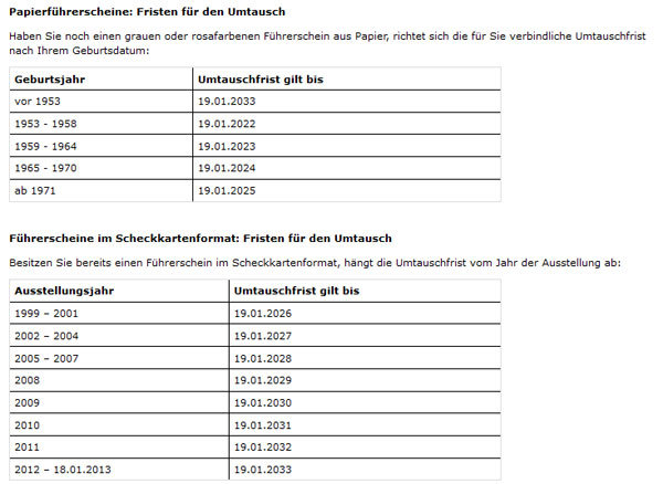 Bis zum 19. Januar 2033 müssen alle bisher unbefristet ausgestellten Führerscheine umgetauscht werden. Dies gilt für alle Papierführerscheine (grau oder rosa) sowie für Kartenführerscheine, die vor dem 19. Januar 2013 ausgestellt worden sind.