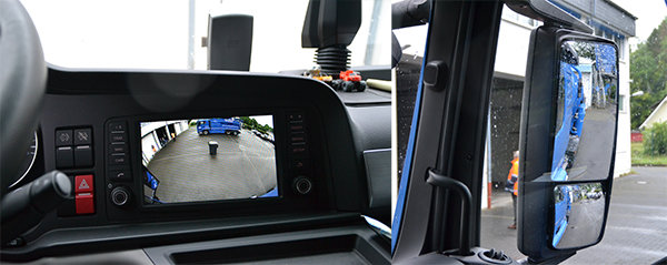 [Während die Mülltonne über den rechten Seitenspiegel nicht zu sehen ist, wird sie über das Kamerasystem sichtbar.]