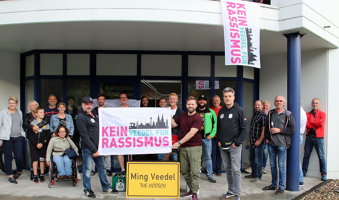 Das Herz von Dirk Meierlücke, Sänger von The Höösch, schlägt nach wie vor für seine Geburtsstadt Köln, obwohl er schon seit vielen Jahren in Engelskirchen heimisch ist. So war ihm selbstverständlich auch die Initiative „Kein Veedel für Rassismus“ bekannt. Da Meierlücke der Meinung ist, dass Rassismus nicht an der Kölner Stadtgrenze haltmacht, nahm er spontan Kontakt mit den Initiatoren auf - unterstützt von seinen Bandmitgliedern Markus Remmel, Timo Traska, Ilja Engel, Christoph Rüßmann, Thomas Lipski und Stefan Frösler. Die Idee kam in der Domstadt so gut an, dass das Bergische Land kurzerhand zum 87. Veedel ernannt wurde. In Köln waren 11.000 Fahnen mit dem Spruch „Kein Veedel für Rassismus“ durch Crowdfunding finanziert worden. Gestern nun hatten Interessierte die Möglichkeit, am Proberaum von The Höösch in Loope Fahnen gegen eine Spende zu erwerben und so auch in der Region Flagge zu zeigen. Verschiedene Bands wie Bläck Fööss, Höhner und Cat Ballou unterstützen die Aktion.