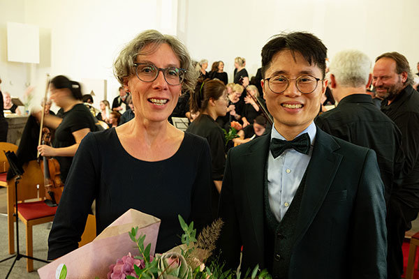 [Kreiskantorin Annemarie Sirrenberg und Kantor DooJin Park aus der evangelischen Kirchengemeinde Waldbröl hatten über ein halbes Jahr mit den Chören geprobt und dirigierten beim Konzert im Wechsel.]