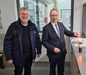 [Gemeinsam mit Landrat Jochen Hagt (r.) entzündete Norbert Schmitz das Friedenslicht in der Gummersbacher Polizeiwache.]
