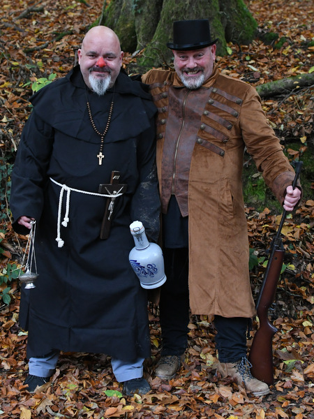 Am Wochenende war es so weit und ein gewisser Alfons Ambrosius empfing am Kassenhäuschen der Aggertalhöhle die Besuchergruppen, die sich durch ihre Anmeldung zur Suche in den Gängen der Höhle anschließen wollten. Wie sich herausstellte, war es jedoch zu einer Verwechslung gekommen, denn dieser Herr Ambrosius war ein eigentlich insolventer Zirkusdirektor, etwas skeptisch der gestellten Aufgabe gegenüber, aber vom Jobcenter dazu beauftragt worden. „Das ist jetzt aber dumm“, erklärte Ambrosius, dargestellt von Andreas Berresheim, mehrfach ängstlich. “Ich habe aber noch meinen Bruder Rudolf aus Rom herbestellt, der ist Mönch und sollte sich mit so was auskennen.“ In diesem Moment torkelte, eine Weinamphore schwenkend, besagter Zwillingsbruder mit roter Nase auf die Gruppe zu.