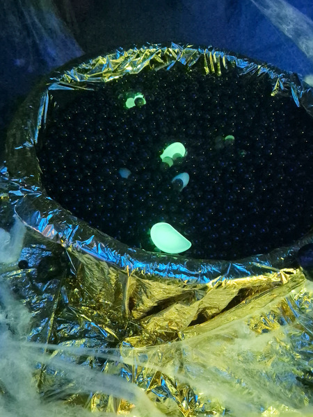 Die tapferen Helfer wurden mit Wasserpistolen ausgerüstet, damit man die verlorenen Seelen mit dem darin enthaltenen Weihwasser beschießen und so erlösen könne. Bruder Rudolf torkelte brav hinterher und sicherte den jeweiligen Tross ab. In der Höhle wartete mit Darstellerin Annika Berresheim eine mittlerweile zur Hexe mutierte, besorgte Mutter und erklärte das weitere Vorgehen. Eine erste Hürde sollte das Entnehmen eines leuchtenden Seelensteins aus einem Topf mit glibbrigem Inhalt sein. Einige hatten dabei das Gefühl von einer Hand berührt zu werden, was mehrfach zu einem lustigen Schreckeffekt führte.