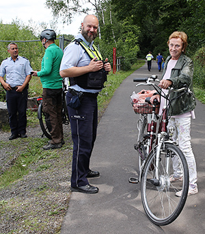 Die Gesprächsthemen waren so vielfältig wie die Nutzer der Strecke. Spaziergänger, oft in Gruppen oder als Familie mit Kinderwagen unterwegs, Hundebesitzer, Jogger, gelassen tourende oder sportlich orientierte Radfahrer, Pedelec- und E-Bike-Nutzer, Skateboard- und Inlinefahrer. Diese Vielfalt birgt laut Polizei Konfliktpotenzial und es ergibt Sinn, sich Gedanken darüber zu machen, welche Seite man nutzt oder welche Geschwindigkeiten überhaupt gefahren werden dürfen. „Wir möchten den Menschen hier auf Gemeinsamkeit und rücksichtsvolle Teilnahme aufmerksam machen“, so Polizeihauptkommissar Uwe Petsching von der Verkehrsunfallprävention und Opferschutz der Polizei in Gummersbach. „Es könnten zwar etwas mehr sein, aber die, die wir hier antreffen, sind begeistert von der Aktion und werden auch ihre Sorgen und Ängste los.“