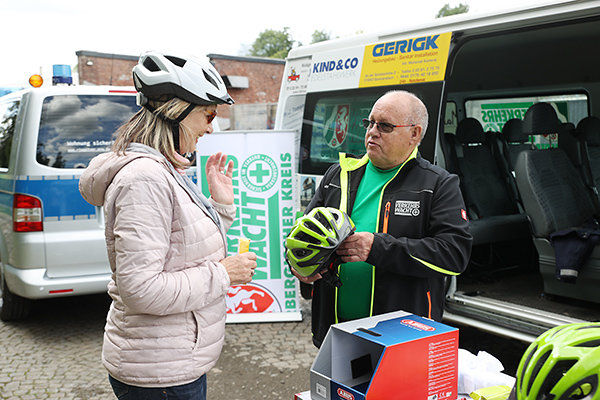 Neben der Polizei war mit Kalle Mülling auch der Leiter der Verkehrswacht Oberbergischer Kreis an einem Informationsstand vor Ort. Er informierte über die Wahl zum richtigen Fahrradhelm. Diese bot die Verkehrswacht zudem als „Großeinkäufer“ für einen günstigen Mitnahmepreis an und legte noch eine Warnweste obendrauf. „Ich helfe den Kollegen von der Polizei, auf die Gefahren hier auf der Bahntrasse aufmerksam zu machen, die sich im Begegnungsverkehr der unterschiedlichen Benutzer ergeben“, so Mülling. Der Pensionär war 42 Jahre lang Polizeibeamter.