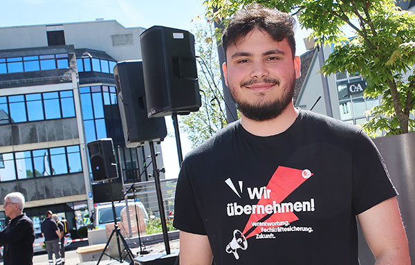 Als stellvertretender Vorsitzender des Gummersbacher IG Metall-Ortsjugendausschusses stellte Eren Caylak die Übernahme von Auszubildenden ins reguläre Arbeitsverhältnis in den Mittelpunkt seines Redebeitrags. Der 21-jährige Mechatroniker forderte einen grundsätzlichen Anspruch auf unbefristete Übernahme für alle Auszubildenden, die als „Fachkräfte für morgen“ perspektivische Sicherheit für die Lebensplanung benötigten. „Die Übernahme ist kein Geschenk, die Übernahme ist ein Recht“.