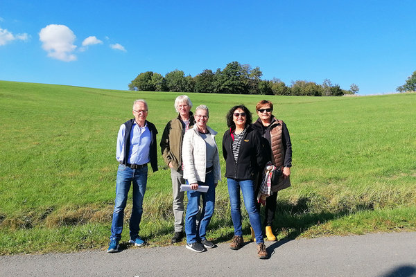 [(v.l.) Gerhard Jäckel, Uwe Kürschgen, Gabriele Wolf, Maria Verna und Birgit Fastenrath sind vor der Schlittenwiese in Herreshagen zusammengekommen.]