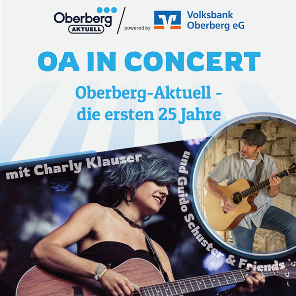 Oberberg-Aktuell gibt es seit nunmehr 25 Jahren – und das wollen wir feiern! Dazu veranstalten wir am Donnerstag, 19. September, powered by der Volksbank Oberberg „OA in Concert“. Für Musik werden an dem Abend Charly Klauser sowie „Guido Schuster & Friends“ sorgen. Charly Klauser ist 34 Jahre alt und stammt aus einer Kölner Musikerfamilie. Sie ist als Multi-Instrumentalistin, Songwriterin und Produzentin aktiv und stand dabei unter anderem schon unzählige Male mit Peter Maffay oder auch Carolin Kebekus auf der Bühne. Guido Schuster ist Gitarrist und immer wieder auf Bühnen im Oberbergischen zu finden. Los geht es um 18 Uhr.