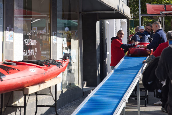 In der Innenstadt von Wipperfürth hatte man groß aufgefahren. Es gab einen Floh- und Antikmarkt, Kindertrödel, Karussells für die kleinen Gäste, Stände mit Süßigkeiten, Malen für Kinder, eine Hüpfburg sowie Snacks und Getränke, wohin das Auge reicht. Die Kanufreunde hatten eine Rutsche aufgebaut. Mädchen und Jungen konnten darauf in einem Minikanu sitzen (Foto oben). Die DLRG präsentierte ein echtes Rettungsboot. Das KunO-Mobil hatte verschiedene Bewegungs-, Spiel- und Kunstangebote im Gepäck.