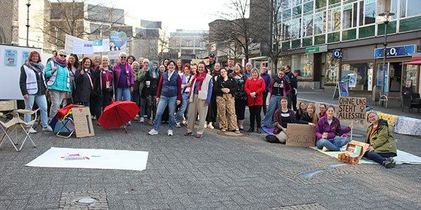 Einen Tag nach dem Weltfrauentag haben heute mehr als 50 Frauen und einige Männer an der Aktion „Take a Break – und die Welt steht still“ auf dem Gummersbacher Lindenplatz teilgenommen. Bundesweit hatte das Töchterkollektiv zum Frauenstreik aufgerufen, in Gummersbach haben die Marienheiderinnen Marieke Ilem und Henrike Loh parteiunabhängig eine Veranstaltung für das Oberbergische organisiert. Im Fokus: Strukturelle Ungleichheiten, die Frauen bis heute betreffen, die ungleiche Verteilung von Care-Arbeit (Haus-, Pflegearbeit und Kinderpflege), aber auch Gewalt gegen Mädchen und Frauen.