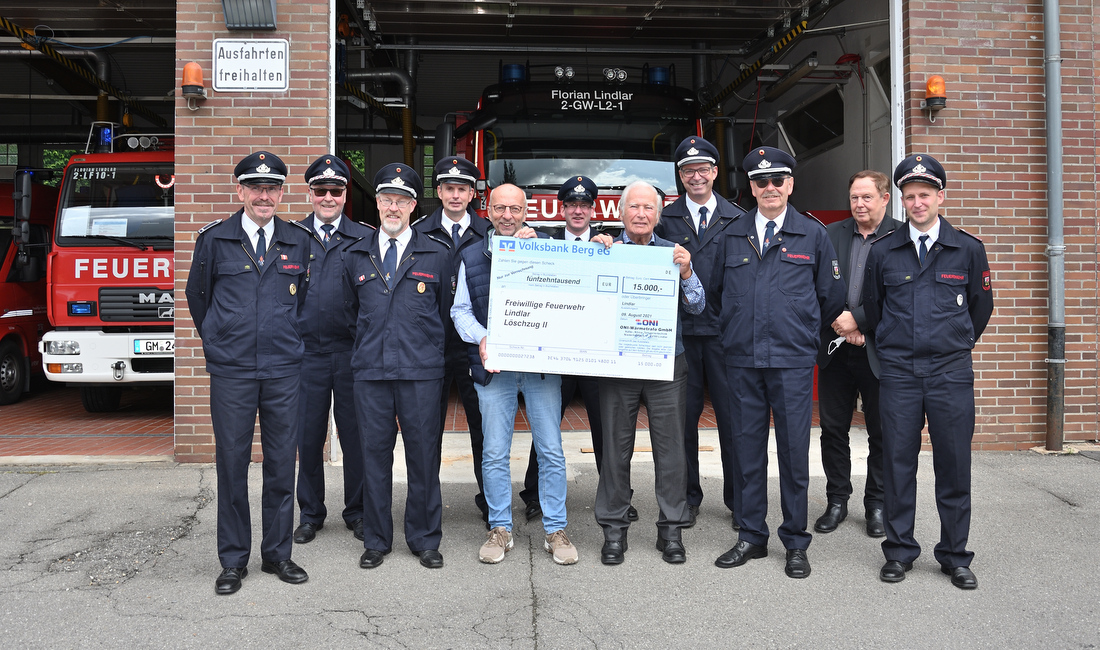Lindlar – ONI-Chef Wolfgang Oehm und ein Geschäftspartner spendeten dem Löschzug Frielingsdorf/Scheel 15.000 €, nachdem die Wehrmänner den Serverraum des Unternehmens vor dem Hochwasser retten konnten.