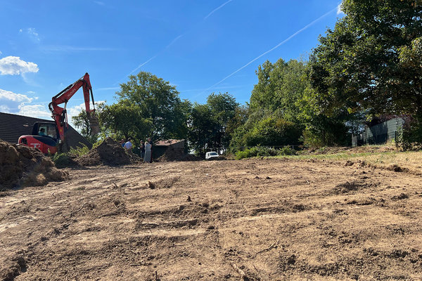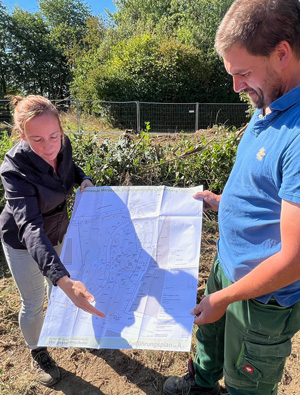 Zum Spatenstich heute Morgen hatte sich deswegen eine große Schar von Vertretern in Lichtenberg versammelt. Allen voran die Landschaftsarchitektin Adriane Baakes-Zauner, die mit ihrem Krefelder Büro federführend das Projekt geplant hat und gemeinsam mit dem Bauleiter vor Ort, Jan Eyberg, das künftige „Eldorado“ anhand der Pläne skizzierte (Foto). Entstehen wird dort als Herzstück ein Atrium mit drei im Halbkreis angeordneten Sitzbänken und Pergola hinter einer Fläche für Redner oder Künstler, die zur Beschattung dienen soll. Ansonsten wird es dort naturreich und ökologisch, so schreiben es auch die Förderrichtlinien vor. „Es wird ein Weg mit verschiedenen Obstbäumen und Sitzgelegenheiten gebaut“, so Baakes-Zauner.