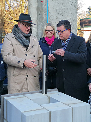 Bürgermeister Helmenstein steckte vor der Grundsteinlegung eine Ein-Euro-Münze und einen Anhänger des Gummersbacher VfL in die Zeitkapsel – vielleicht in der Hoffnung, dass in der Hülsenbuscher Kita künftige Bundesligaspieler ihre ersten Schritte machen.