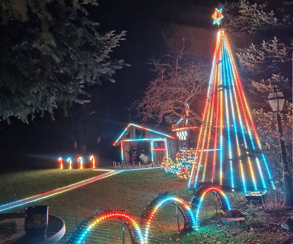 Extra für den Mini-Markt hat Haase eine kleine Lichtshow selbst programmiert und gestaltet. „Die läuft synchron mit Weihnachtsmusik“, erzählt Haase. Das kunterbunte Erlebnis ist in der Woche zu jeder vollen Stunde von 18 bis 20 Uhr und am Wochenende von 17 bis 20 Uhr zu erleben. In dieser Zeit sind auch die Haases an der Hütte anzutreffen, um mit Freunden und Fremden ein wenig zu quatschen, sich auszutauschen und eine schöne Zeit zu verleben. Für die Leckereien sorgen sie selbst. Ein kleines Angebot mit selbst gebastelten und selbstgemachten weihnachtlichen Dingen (zum Beispiel Bratapfel-Likör oder Marmelade) ergänzt den Markt. Zu Verkaufen gibt es aber nichts, alles wird auf Spendenbasis geregelt.