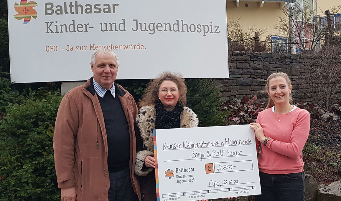 Eine schöne Zeit haben, miteinander ins Gespräch kommen und dabei etwas Gutes tun: Die Idee des eigenen Glühweinstands von Sonja und Ralf Haase hat auch in diesem Jahr viel Zuspruch gefunden. Viele Menschen kamen in den vergangenen Wochen auf einen Glühwein vorbei, nahmen etwas von den selbstgemachten Leckereien auf Spendenbasis mit oder boten für den großen Weihnachtsmann mit. Rund 2.270 Euro sind bis zum Ende der Aktion zusammengekommen, wie die Haases mitteilen. Sie selbst haben den Betrag noch auf 2.300 Euro aufgestockt und haben die Spenden bereits wie angekündigt dem Kinderhospiz Olpe übergeben. Überreicht haben sie zudem den versteigerten Weihnachtsmann: Ersteigert hatte ihn für exakt 100,02 Euro die Familie Dirk und Sandra Valbert aus Hunsheim.