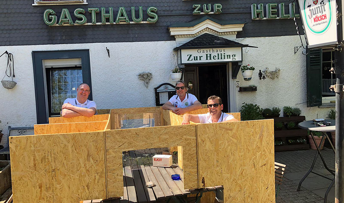 „Eigentlich war das alles nur als eine Spaß-Aktion gedacht“, sagt Initiator Hartmut Ernst. Der Architekt aus Lindlar-Schümmerich und seine Stammtisch-Kollegen, alles ehemalige Fußballer des TuS Lindlar, wollten sich unbedingt wieder zu ihrer gewohnten Runde treffen. Aufgrund der aktuellen Situation ist dies aber seit einigen Wochen nicht möglich. Daher kam Ernst auf die Idee der sogenannten Corona-Minikneipe. Aus Solidarität zu ihrem Stammwirt Stephan „Balou“ Reif stellten sie den Prototypen ihrer Erfindung vor dessen Gaststätte „Zur Helling“ in Lindlar auf.
