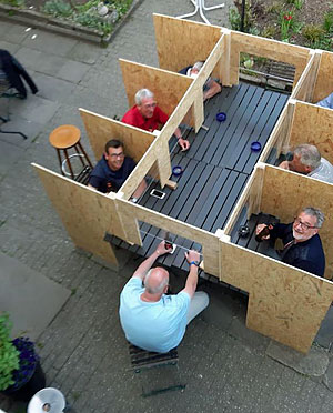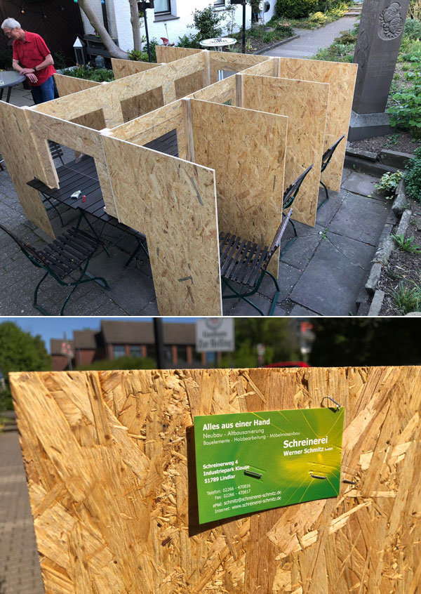 Diese besteht aus Konstruktionsholz, handelsüblichen OSB-Platten und Plexiglas. Die Platten schützen in seitlicher Richtung, die Scheiben den gegenübersitzenden Gast. So soll eine Übertragung der Viren vermieden werden. Nach vorne hin gibt es eine kleine Durchreiche, damit zünftig mit einer Flasche Kölsch angestoßen werden kann. Zudem ist jeder der acht Sitzplätze mit einem eigenen Knobelbecher und einem Aschenbecher ausgestattet. „Wir sind der Meinung, das ist save“, sagt Ernst. Zudem kann die Minikneipe mit einer Plane regenfest gemacht werden.