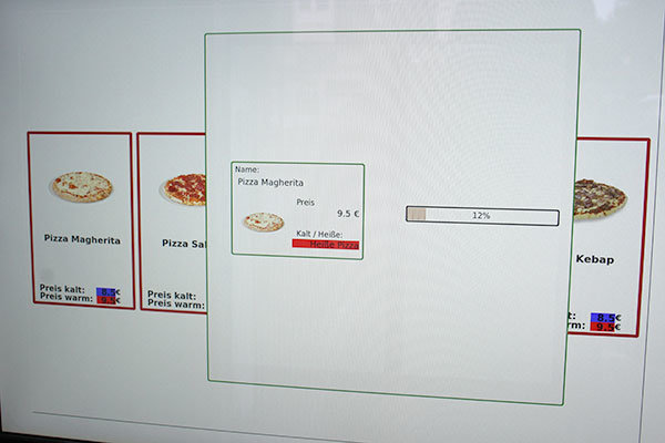 Das Prinzip des Automaten ist einfach. Im Kühlbereich lagern bis zu 60 Tiefkühlpizzen in ihren Kartons und warten auf ihren Einsatz. Das Produkt wird nach der Auswahl per Lifter vor den Ofen im anderen Teil des Geräts gebracht, wo die Pizza aus dem Karton und in den Ofen manövriert wird. Dieser habe eine Grundtemperatur von 200 Grad. Nach rund vier Minuten Backzeit geht es für die Pizza wieder in den Karton und durch den Ausgabeschlitz zum Kunden. Rund drei Monate steht der Automat bereits in Waldbröl, die Probephase habe aber Zeit in Anspruch genommen. „In der Maschine ist viel Sensorik, das muss alles gut aufeinander eingestellt sein, dass es glatt durchläuft.“