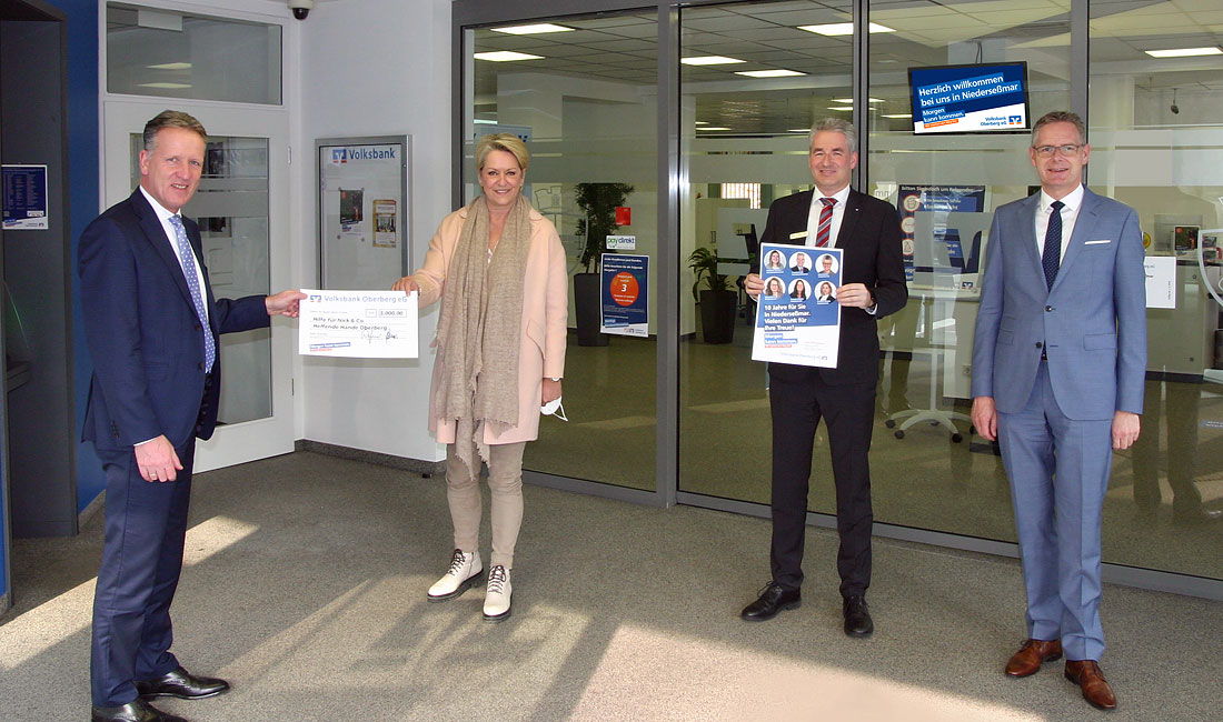 Der Vorstandsvorsitzende Ingo Stockhausen überreichte gemeinsam mit Niederlassungsleiter Henning Zöller und Thorsten Franz der Vereinsvorsitzenden Bettina Hühn einen Scheck über 5.000 Euro. Dieses Geld soll in ein aktuelles Hilfsprojekt fließen. Piet und Jascha, zwei achtjährige eineiige Zwillinge, leiden an einem äußerst seltenen Gendefekt und benötigen permanente Therapiebetreuung. „Ich danke der Volksbank Oberberg ganz herzlich für ihre Unterstützung anlässlich unserer beiden Jubiläen. Gerade in der momentanen Situation fehlt uns natürlich häufig die Präsenz in der Öffentlichkeit, um auf unser Anliegen und die nicht weniger werdenden Hilfsprojekte aufmerksam zu machen“, erklärte Hühn.