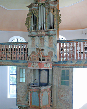 [Symbolisch bedeutsam präsentieren sich Orgel, Prospekt und Kanzel in der Odenspieler Kirche in kreuzförmiger Anordnung.]