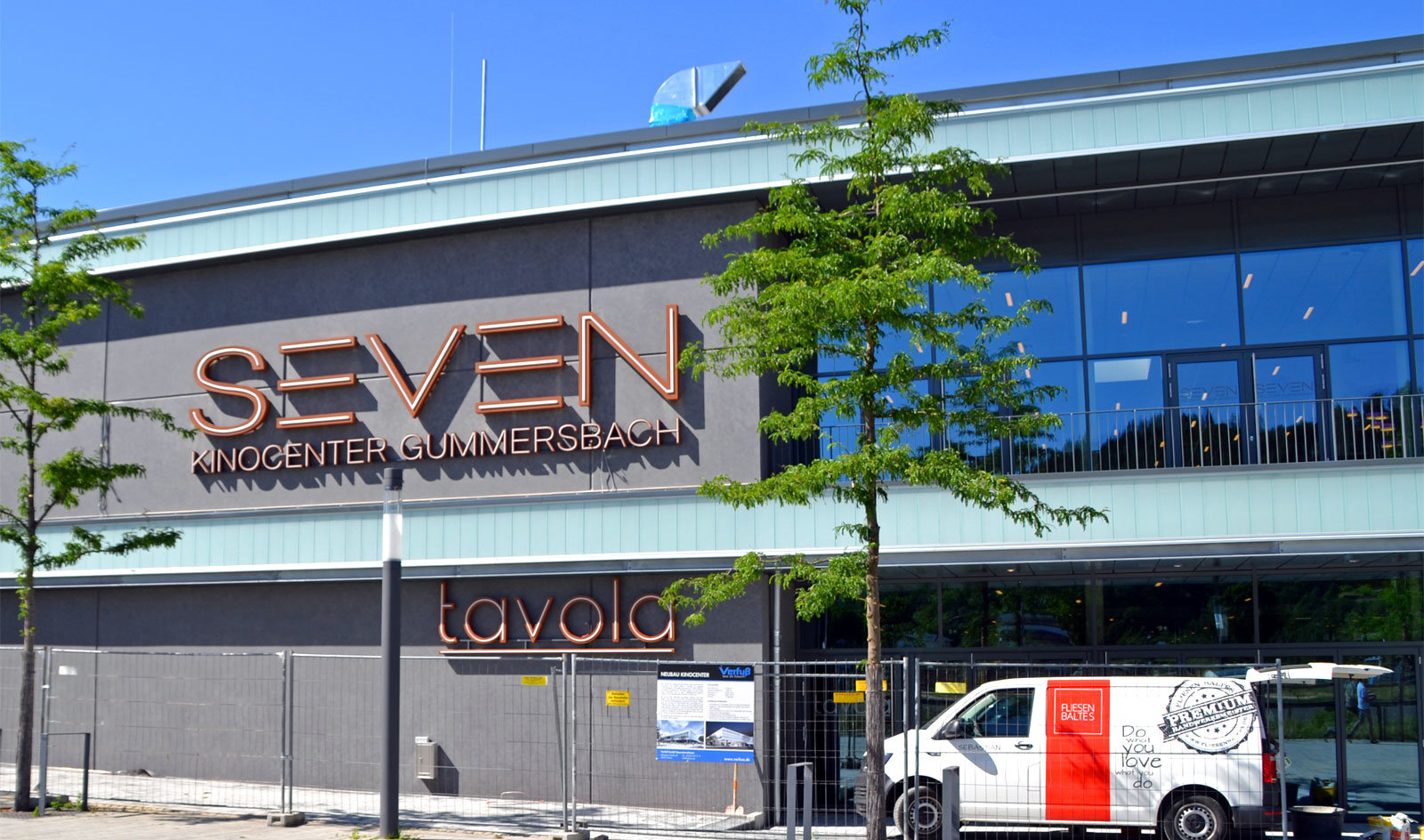 Gummersbach – Die Firma sign & store solutions aus Gummersbach hat die beleuchtete Fassadenbeschriftung für das neue Kino realisiert – Auch Weltunternehmen wie Tesla gehören zum Kundenkreis.