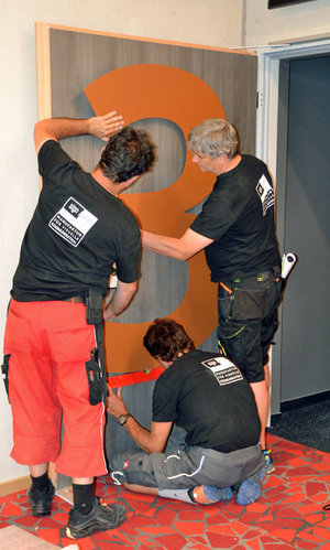 Das Prunkstück ist der acht Meter breite, zwei Meter hohe und beleuchtete Schriftzug an der Frontseite des Gebäudes. „Für ein so außergewöhnliches Objekt wollten wir keine gewöhnliche Beleuchtung“, so Kempe, der deshalb einen Schriftzug in Neonoptik wie er bei alten Lichtspielhäusern entwickelte. Architekten, Bauherr und Investor waren von der Idee angetan und so konnte schließlich vergangene Woche der Aufbau stattfinden.