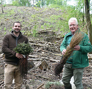 [Steffen Brenner und Martin Sellmann (re.) (Heinsberger Forstbaumschulen M. Balzer-Sellmann) mit einigen Setzlingen des Klimawaldes.]