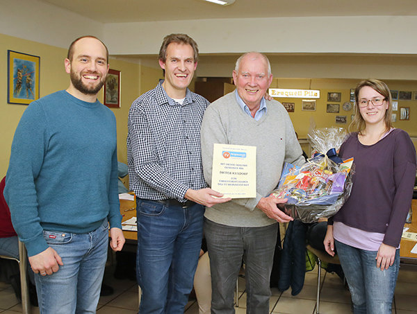 [Auf der Vorstandssitzung des TV Bergneustadt am 10. März wurde Dieter Kuxdorf in seiner Eigenschaft als Vorsitzender von seinem Sohn Stefan (2. v. l.) abgelöst und zum Ehrenvorsitzenden ernannt. Mit auf dem Bild: Kassenwart Jens Achenbach und Geschäftsführerin Inka Mertens.]